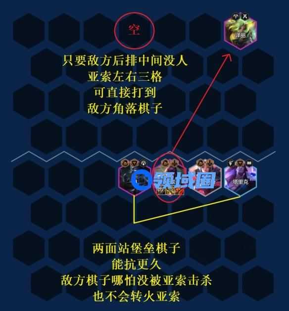 而这个是吃攻击距离的,携带火炮的亚索第一排左右3格子站位,只要敌方最后一排中间没有棋子,亚索就能直接打到敌方角落的C位,可直接秒脆皮。