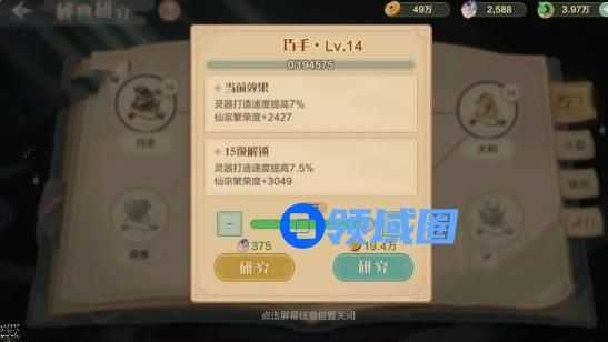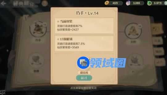 同样,升级需先达成前置条件,达成后,可选择花费时间升级或花费仙玉立即升级。