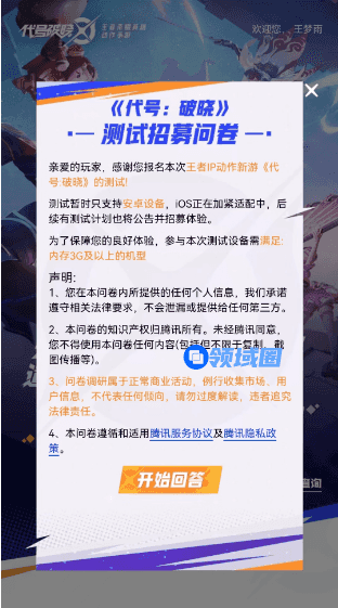 3、查看测试资格调查问卷的详细说明,目前该测试仅限安卓手机用户,IOS还在开发中。