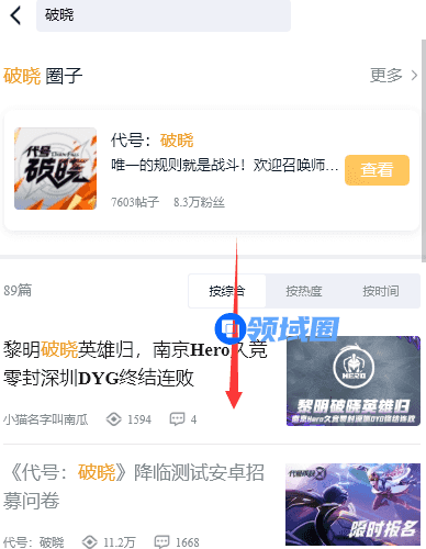2、进入王者营地之后,在顶部搜索框输入代号破晓,点击下图的搜索结果。
