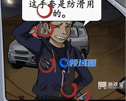 2、第一个拦路者,停(否则车祸),5处:黑色手套,耳环,划破的衣服,衣服上的泥,铁锹。不帮助。