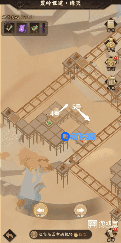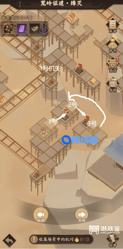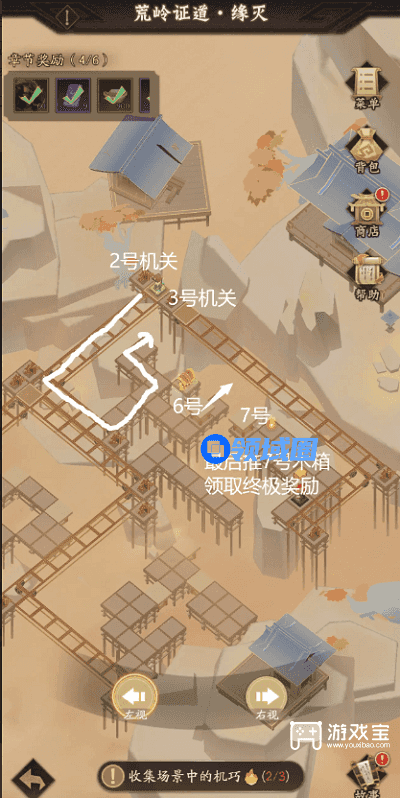3、图3,最后来到2号机关处切换左视角下可以控制3号机关让地块移动至3号机关旁,切换右视角沿白线即可登上3号机关旁地块,顺便将6号木箱推到与7号木箱位于同一水平线上。乘坐3号机关到达终点切换左视推动67木箱领取终极大奖。(小提示:如果在战斗中有伙伴阵亡,可以在商店购买复活和提升属性的符咒)