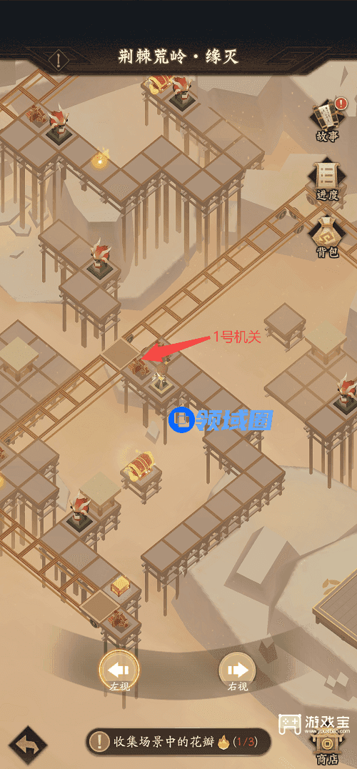 1、先来到1号机关处点击机关,将滑轨地块调配过来备用,切换右视向右下方继续前进,切换左视角推动箱子领取宝箱后进入滑轨,通过滑轨来到方才备用的地块点击1号机关进入新区域拾取花瓣,推动箱子获得奖励。