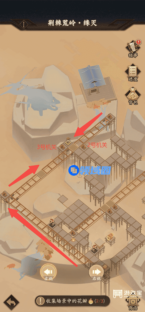 2、切换视角击败敌人后来到2号机关处乘坐第二段滑轨,特别的如图标记了活动地块的运行方向,需要点击1次2号机关来到3号机关处,点击两次3号机关才可上车,到达滑轨终点后推动宝箱领取终极奖励。