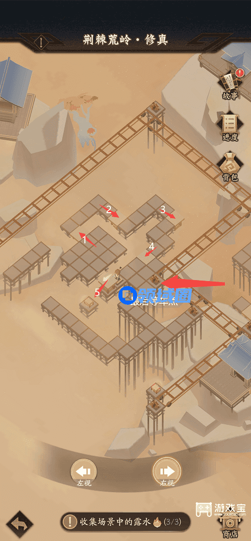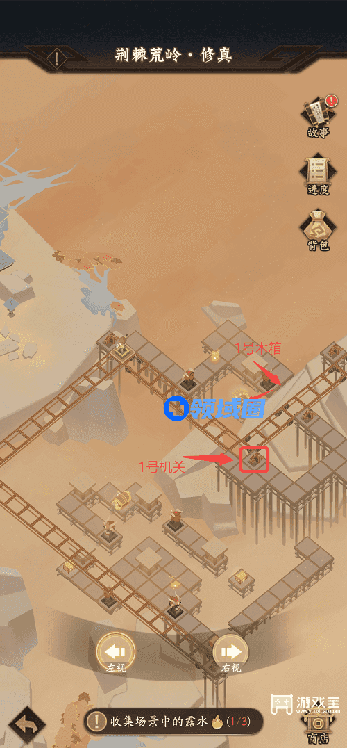1、首先切换右视角领取第一个宝箱,来到1号机关处,多次点击让地块划过来站上去后再次点击机关即可前往图示位置,推动1号木箱领取宝箱奖励。