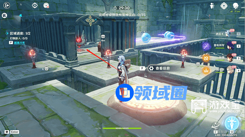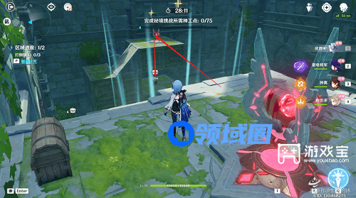 借助四叶印,飞到对面,打掉增幅器,下去开启4号宝箱,然后打怪,钟离eq,阿贝多e,破盾,雷神e,优菈eq切人引爆大剑,进入下一个区域。