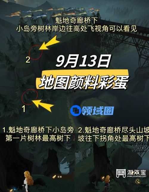 1、今天两个彩蛋位置略刁钻,在魁地奇廊桥附近。可以从下方湖心小岛旁树林岸边,往高处飞视角能看见一眼看见两个彩蛋。
