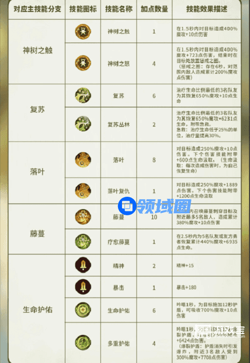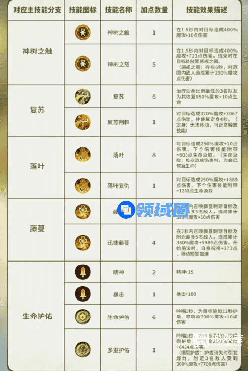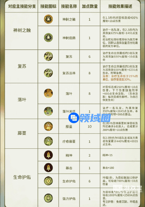 如果在技能点有限的情况下,最好优先集中将一个技能的等级冲高!其中技能·复苏丛林对低血量的队友有额外的治疗效果,在挑战难度较高的作战场景中会起到很关键的效果,建议优先加点!