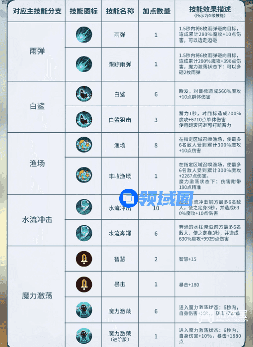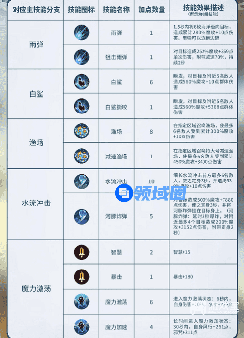 2、后续技能加点优先级:在上述加点方案的基础上,各分支技能加点优先级为:水流奔涌>白鲨狙击>丰收渔场>跟踪雨弹>魔力激荡(进阶版)