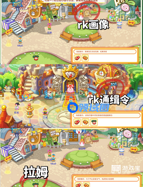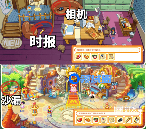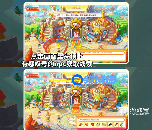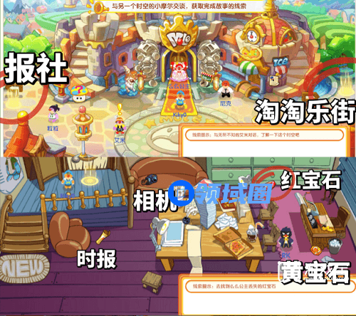1、首先我们进入页面,点击头顶上有感叹号的npc对话 获得线索,左侧发光点为报社,右侧发光点为淘淘乐街~8个线索依次如下: