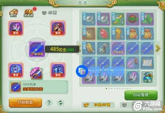 玩家点击功能栏的合成按钮即可参与此玩法,首先需要将想要进行升阶的装备(道具)拖动到中间的方格,然后点击一键配置,系统会自动将同品阶的4个没用的装备(道具)配置上去,然后在点击开始合成即可将要要提升的装备(道具)升级到更高的品阶。