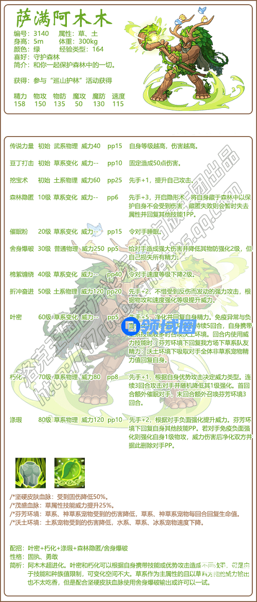 3、简析:阿木木超进化。叶密和朽化可以根据自身携带技能或优势攻击造成不同效果,但是由于技能和种族值限制,可变化空间不大。草系作为主属性的且以草系为主的威力输出也不太吃香,但是配合坚硬皮肤血脉使用舍身爆破输出或许可以一试。