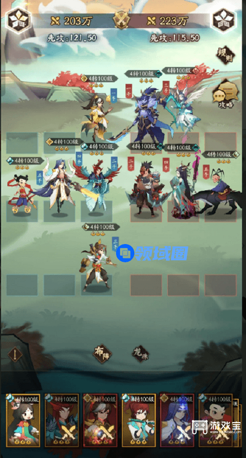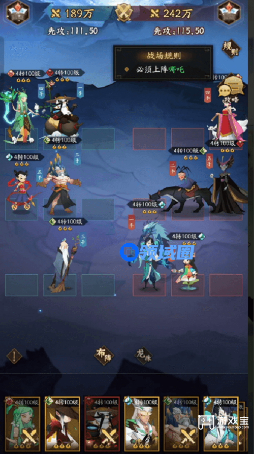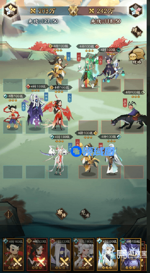 3、从东海寻宝开始就有些难度了,由于对面的阵容比较控,这里用到一个关键人物玄武来解控,直接丢中间十字范围内的队友都能吃到解控效果。