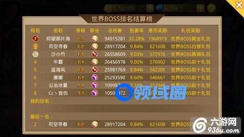世界BOSS结束后即弹出结算界面,详细列出了每个人的奖励与伤害。