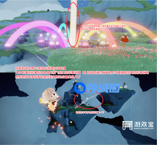 4、7.20号激活彩蛋后由中央光柱飞到高空彩蛋区域或和好友通过背背的方式直接前往高空彩蛋区域然后和好友手拉手在图示彩虹桥的位置晃悠几下