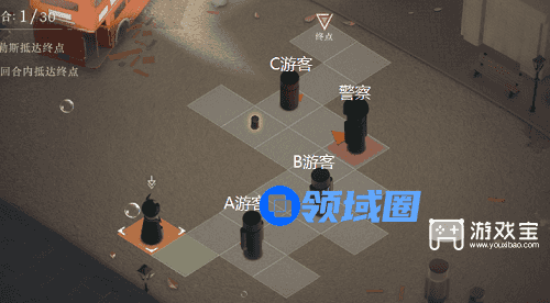 ③这个时候C游客就会把警察给一直拦在那个为止无法行动,我们就趁这个机会直接一口气走到终点,最终用了14个回合就到终点了。
