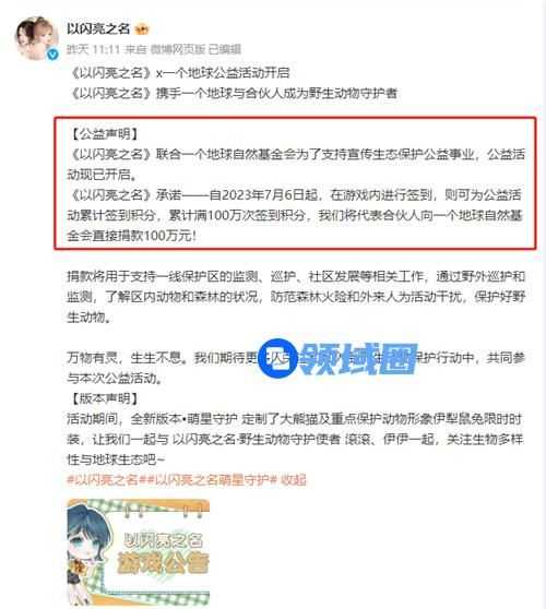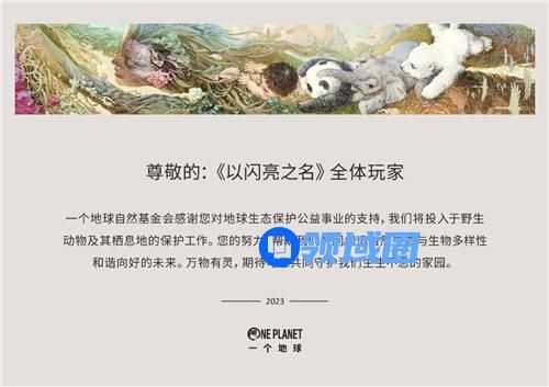 在圈养大熊猫受到越来越多喜爱的同时,也有更多目光聚焦到野外大熊猫的保护工作上——以闪亮之名于7月6日与一个地球自然基金会发起了公益活动,玩家登录签到累计超过100万积分,以闪承诺将代表全体玩家向一个地球自然基金会直接捐款100万元!以支持宣传地球生态保护公益事业,希望能调动起更多玩家一起关注野生动物的保护。