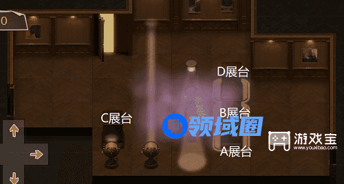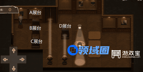 进来之后我们能看到场上一共有4个【展柜】,这关我们需要充分利用这四个展柜来帮助我们通过这关,小编先把这4个展柜取了一个编号分别是A、B、C、D以便我们等下好区分。