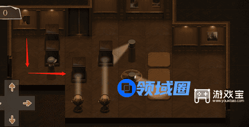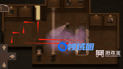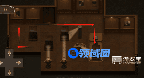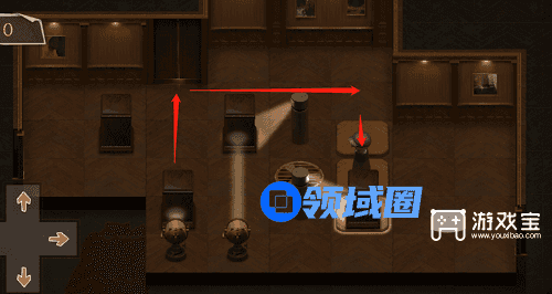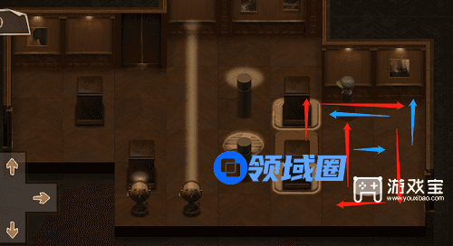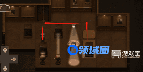 ①首先我们需要把C展柜推到最下面第一个探照灯面前挡住第一个探照灯的灯光,然后我们才能开始下一步的操作。