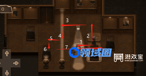 ⑤第五步我们先踩到面前的这个风扇,制造迷雾,然后再绕一圈把D展柜往下推一格推到风扇的左边,然后我们在绕到D展柜的左边一鼓作气直接推到指定位置,我们按照如下图所示的方式,按照1-7的步骤操作,记住!把烟雾踩出来了以后一定要快,一定要在迷雾时间内把D展台推到这里,如果你觉得你浪费了一点时间,那么推荐你重新回去再踩一下烟雾。