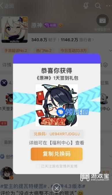 原神在最近和微博联动推出了对应的兑换码可以领取,玩家使用以后可以获得原石、材料等奖励,但很多玩家不知道原神微博签到兑换码是怎么领取的,游戏宝小编带来原神微博签到兑换码领取方法2024,还没领取的赶紧来试试吧。