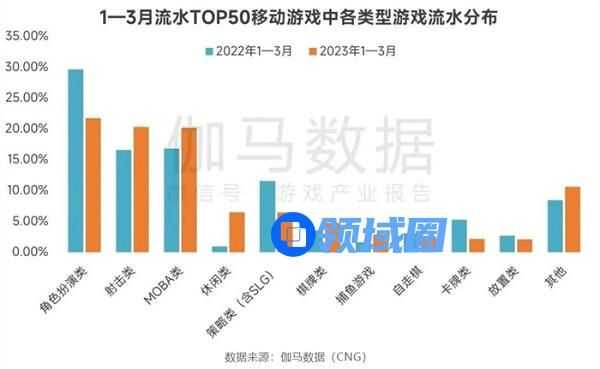今年4月,伽马数据发布的《2023年1-3月游戏产业报告》中披露了一组品类流水分布数据,从图表可以看出,目前角色扮演(MMO)和射击(FPS)仍是最头部的两大赛道,但同样对比去年数据来说,二者的走势却出现了明显的背离: