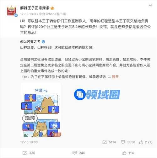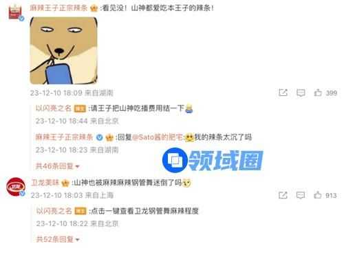 还有两大国产休闲零食品牌——麻辣王子正宗辣条和卫龙食品也一起现身,看起来就这个蹭梗的技术来说,麻辣王子还真是棋高一筹:来的晚但却眼尖认领走了山神嘴里的辣条。