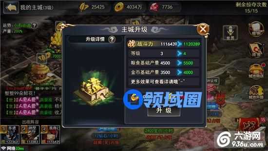 城池可以通过使用金币和粮食来进行升级。城池升级之后不光能提升战斗力,还能够增加金币和粮食的基础产量。
