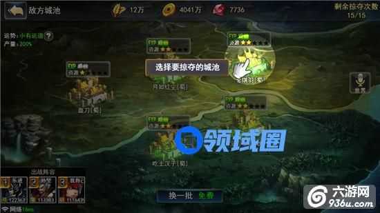 选择地图上可掠夺的城池进行掠夺,掠夺前可查询到对城池的本次掠夺和获得的资源量以及额外奖励的种类。额外奖励包括秘籍、宝箱等。同时玩家可根据查询该城池三名守将的战斗力来判断本次掠夺的成功率。