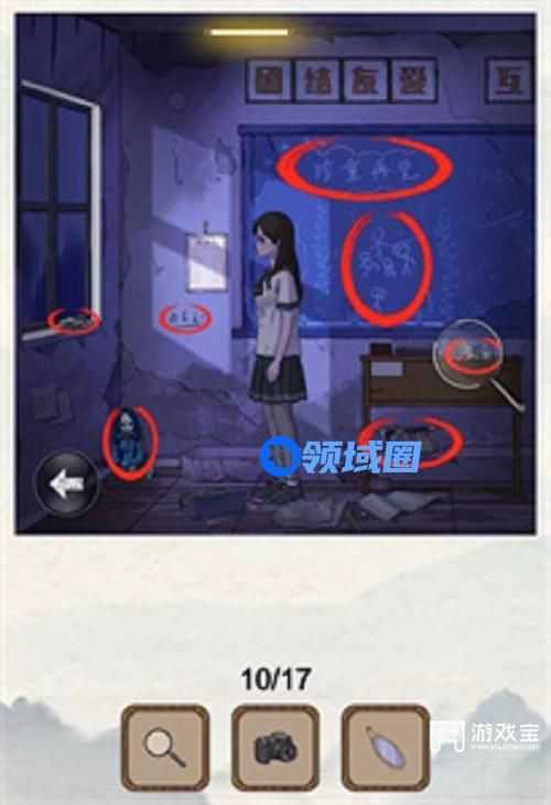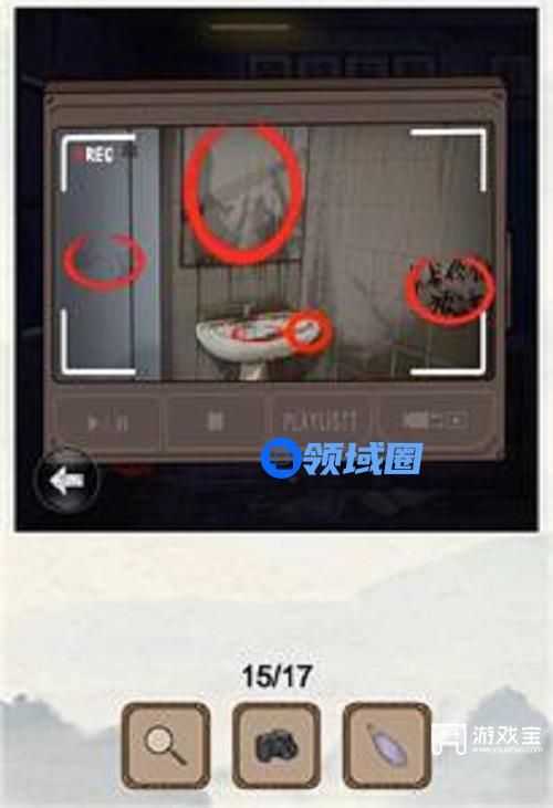 4、最后我们点击摄像机,照片中点击镜子、旁边的门、水池里和剪刀、墙上的字。