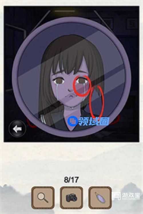 3、点击放大镜,我们利用放大镜找到点击女孩的脸、没有的双腿、和桌上的带血玫瑰。