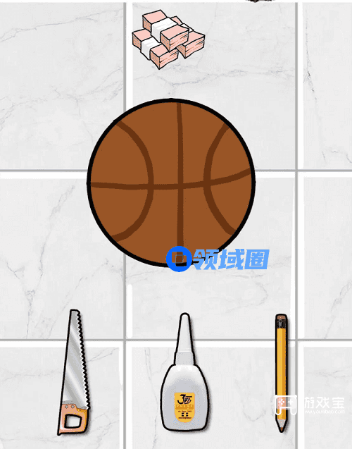 1.用锯锯开篮球,把钱拖入左侧,用胶水把裂缝粘起来,拖动画笔恢复原图。