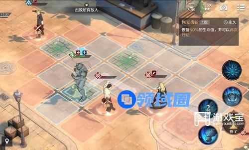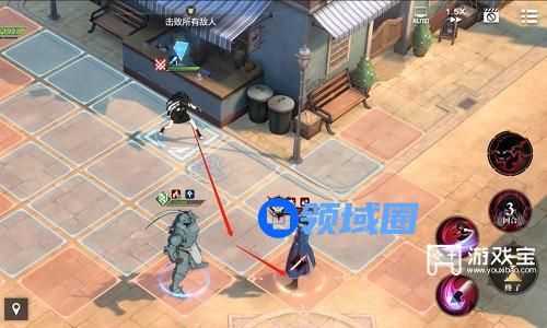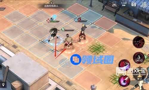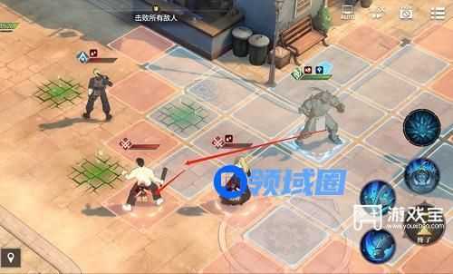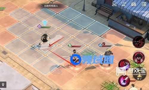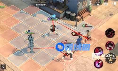 恩维向左上移动,二技能攻击右上敌人,阿尔向右下移动,一技能攻击左下敌人