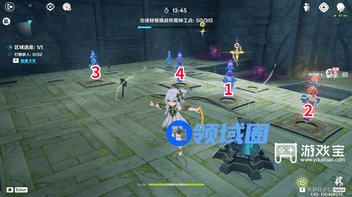 2.如图所示(序号为升级顺序),放置两水两雷一火,纳西妲站在雷塔中间,给出的怪拍照补草元素即可。