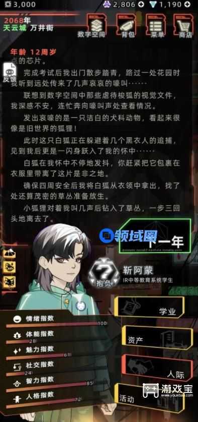 在中等教育阶段时,进行学习或考试操作后,有概率触发涂山瑶事件。选择保护她,便可得到狐狸的注视buff,几年后会触发其任务,完成后便可与涂山瑶成为朋友。