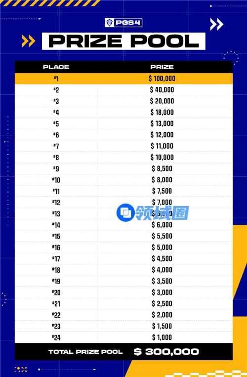 PGS 4的总奖金与PGS3一致,总奖金为30万美元,冠军将获得10万美元,从第2位到第24位的战队将获得4万美元到1000美元的奖金。