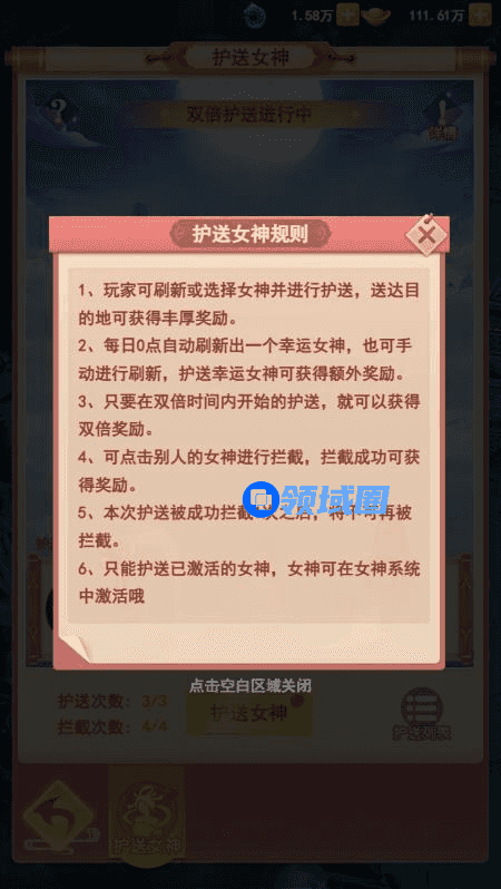 作为女神系统里面的趣味玩法之一,护送女神可是难得与自家女神培养感情的好时刻,况且每一次护送还有丰厚的额外奖励可以拿。不过由于女神们人气太高,所以护送女神也不可能一帆风顺,中途还会遭遇到其他道友们的拦截,说不得其中就有八戒派来的卧底,道友们可要注意小心提防。