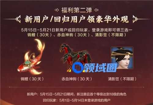 在5月15日-5月21日期间进入游戏的新用户和回归用户可以从“锦鲤(30天)”、“赤血神驹(30天)”、“清影笠(不限期)”三大奖品中任选其一,作为踏入/重回江湖的惊喜。