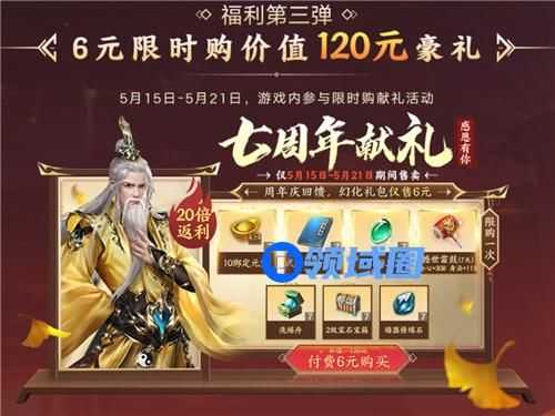 5月15日-5月21日期间,少侠们可以用0.5折的折扣力度,付费6元即可购买“七周年献礼”幻化礼包,获得价值120元的七种资源,优惠力度空前之大!