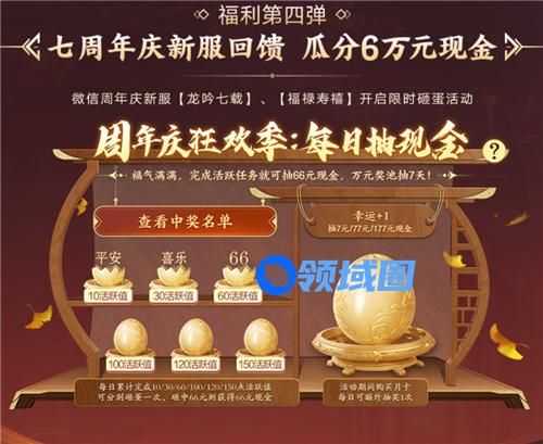 微信周年庆新服【龙吟七载】、【福禄寿禧】将开启限时砸蛋活动,全服均可参加,如果你足够欧皇,还有机会砸出含7数字,直接获得全额奖励!