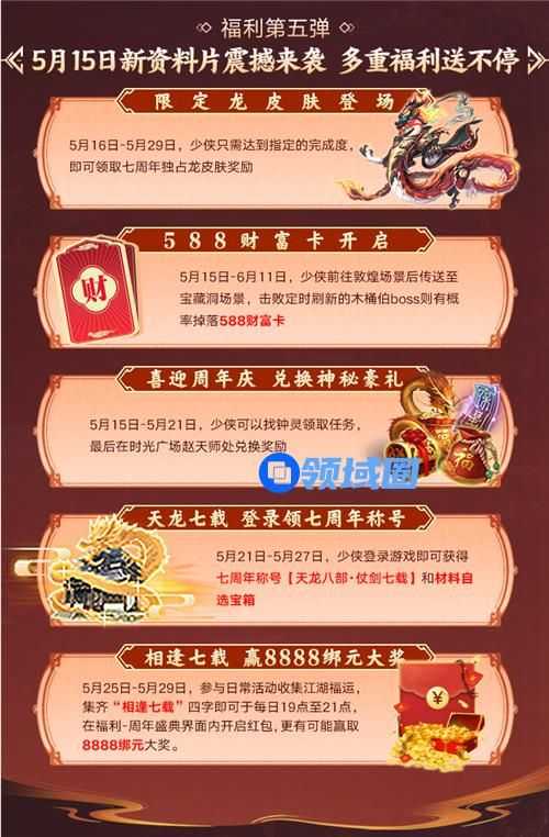 限定龙皮肤、588财富卡、七周年特殊称号、8888绑元大奖、神秘豪礼......周年庆期间,包含海量奖励的多项福利活动都将陆续上线,千万不要错过。