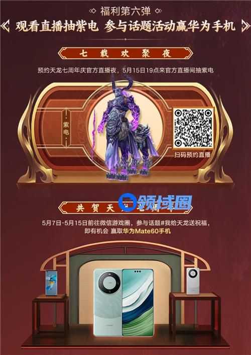 少侠们,预约七周年官方直播夜了吗!5月15日19点可以来官方直播间抽取紫电!错过了也没关系,在5月7日-5月15日期间前往微信游戏圈,参与话题#我给天龙送祝福,还有机会赢取华为Mate60手机!