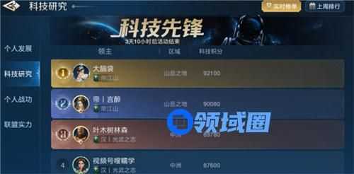 科技研究中【帝江山】的大脑袋以92100的科技积分领先。