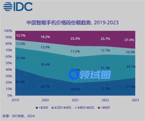 除了AI,高端化将仍然是今年手机市场追逐的主要目标。根据调研机构 IDC 的报告,2023 年,中国智能手机市场 600 美元以上高端市场份额达 27.4%,同比增长了 3.7 个百分点,而代表中端的 200-600 美元产品的市场空间正在收窄。
