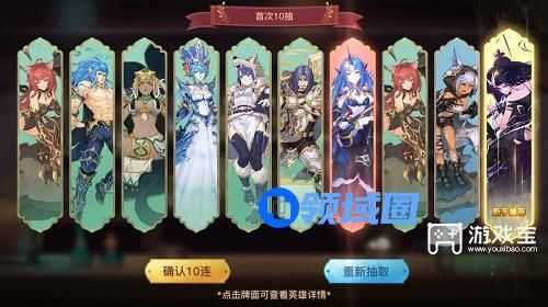 ①点抽卡的卡牌是可以查看英雄详情的,而且首次10连必1幻神1天选。