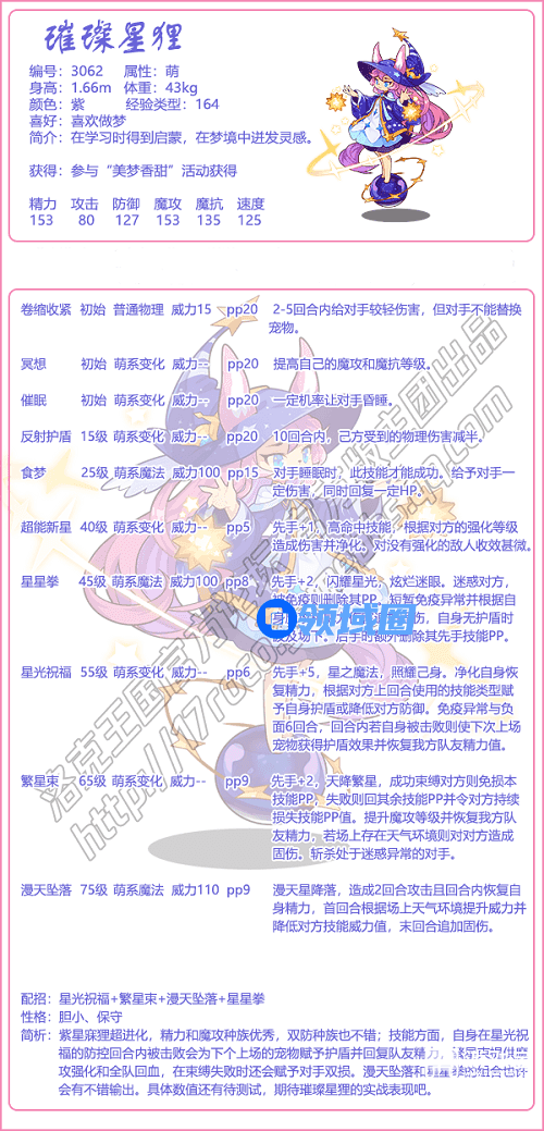 3、简析:紫星寐狸超进化,精力和魔攻种族优秀,双防种族也不错;技能方面,自身在星光祝福的防控回合内被击败会为下个上场的宠物赋予护盾并回复队友精力,繁星束提供魔攻强化和全队回血,在束缚失败时还会赋予对手双损。漫天坠落和星星拳的组合也许会有不错输出。具体数值还有待测试,期待璀璨星狸的实战表现吧。