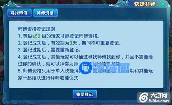 登记成功后,其他玩家可以通过寻找师傅找到你,并且不需要经过你的确认,就可以拜你为师。