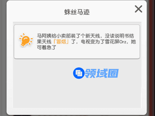 1、蛛丝马迹:马阿姨给小卖部装了个新天线,没读说明书结果天线冒烟了,电视变为了雪花屏Orz,她可着急了。