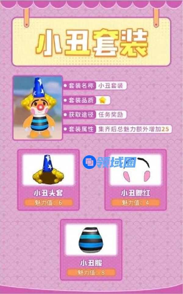 小丑套装一共有3个部件,分别是小丑头套、小丑腮红、小丑服,魅力加成值分别为6、4、8。基础魅力值相加为18点,效果是当玩家集齐这些套装后,总魅力值会额外提高25点。