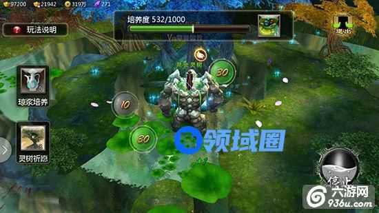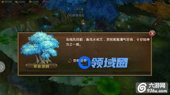 鸟鸣风得韵,鱼戏水成文,灵树周围清气环绕,足以令玩家角色精神为之一振。每日0点到21点可以对帮会灵树进行培养,玩家可以用开启浇灌、琼浆培养和灵树祈愿三种方式对灵树进行培养。值得一提的是,开启浇灌后通过点击不同分值的气泡加速培养,这个游戏过程很像玩打地鼠,很有意思。
